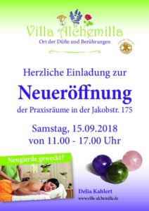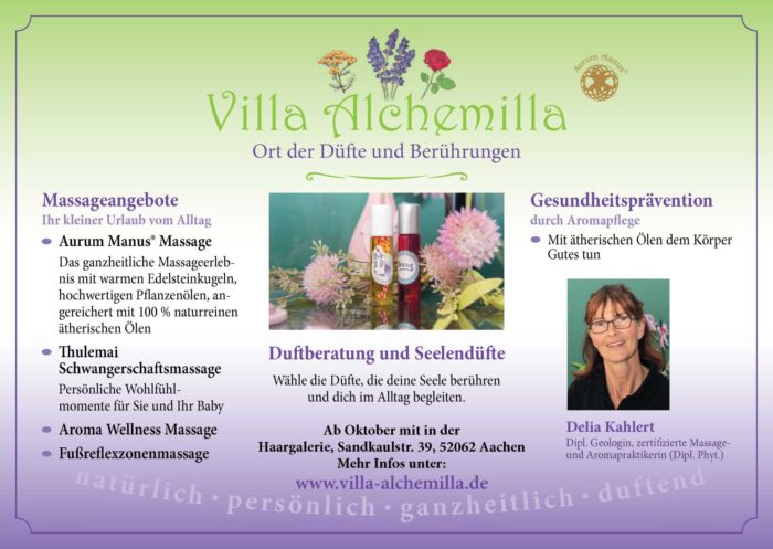 Endlich wird ein Traum wahr: Villa-Alchemilla in eigenen Räumen! Ab dem 16. August 2021 freue ich mich, Sie als meine neuen und Euch als meine treuen, Kundinnen in meiner neuen Wellness Oase "Villa-Alchemilla" in der Südstraße 21-23, 52064 Aachen begrüßen zu können. ![]() |