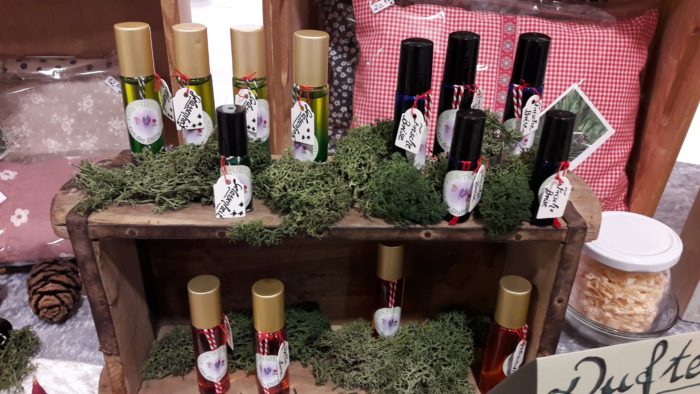 Es gibt etwas für das Leibeswohl (Holundersirup und -Gelee), Gesund-Wohl (Erkältungs- und Nasenbalsam, Kopffrei Roll-On, Beinwell Salbe), Körperwohl (fluffige Körperbutter, Deo-Balsam, Gesichtscreme, Körperbalsam, feste Handcreme) und Seelenwohl (Seelendüfte im Roll-On).
