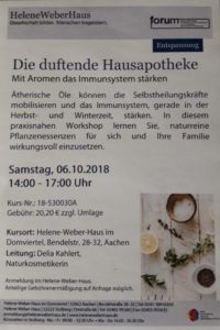 Sie möchten Naturkosmetik selber herstellen und als ganz persönliches Präsent an liebe Freunde verschenken? Am kommenden Samstag, 24.11.18 können Sie das in meinem Workshop im Helene-Weber-Haus, Bendelstraße in Aachen selber ausprobieren. Ich freue mich auf Sie.